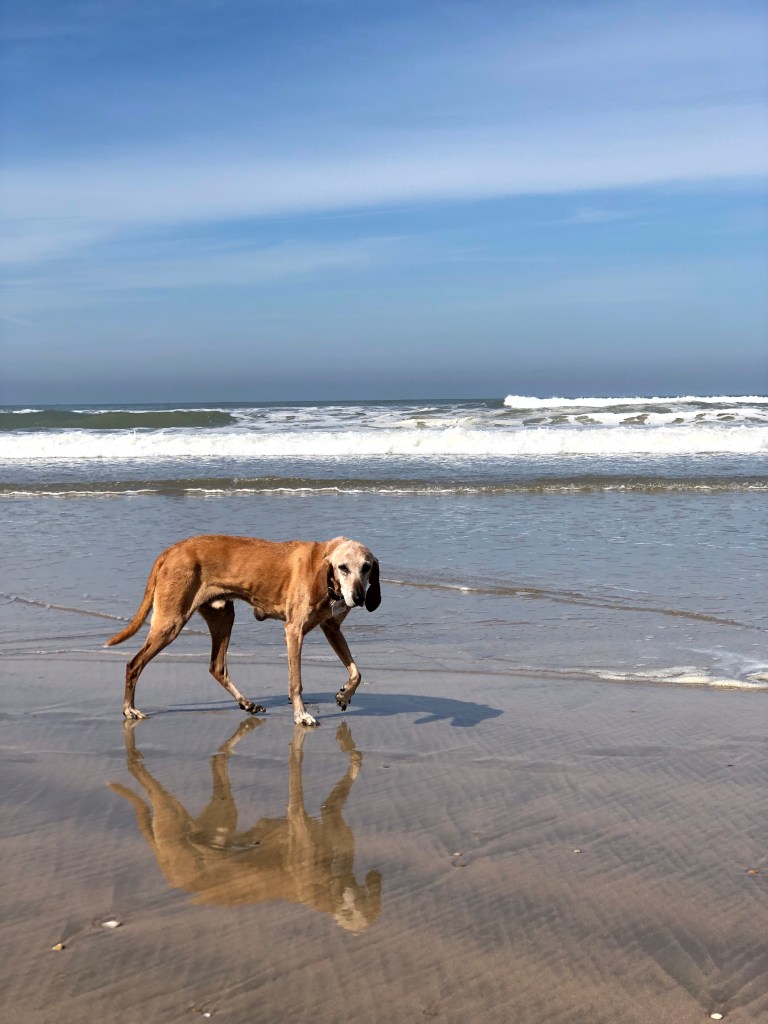 Rocky war von seinem Schlafkissen aufgestanden, und ich sah ihn von hinten, wie er ins Gegenlicht ging. Das hatte etwas Gespenstisches, weil er – ähnlich einer langen Schleppe – seine braune Schmusedecke hinter sich herzog, unter der sich die inzwischen knochigen, abgemagerten Konturen abzeichneten.